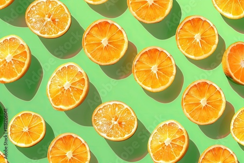 Colorful fruit pattern of fresh orange slices on green background. From top view