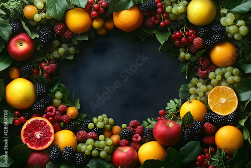 fruit, berry, orange, apple, grape, red, yellow, green, black, fresh, healthy, food, vitamin, nutrient, circle, chaplet, arrangement, background, dark, dark blue, composition, still, life, display, closeup, whole, fruit, sliced, seasonal, summer, autumn, natural, light, vibrant