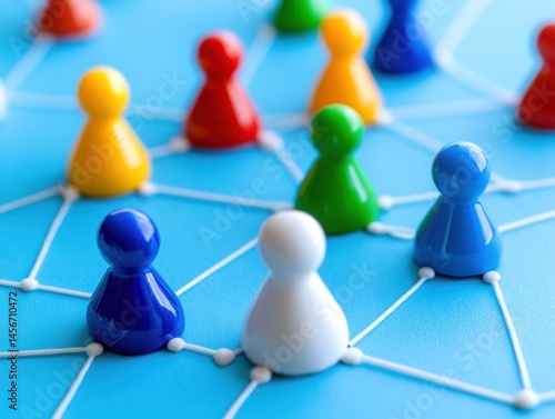 network, connection, teamwork, collaboration, communication, strategy, community, human relationships, partnership, management, leadership, organisation, structure, system, team, group, member, affiliate, society, union, alliance, oneness, bond, link, web, grid, node, point, line, blue, colours, piece, game, toy, figure, pawn, plastic, white, red, green, yellow, orange, closeup, bright, business, concept, idea, solution, abstract