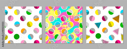 Colorful geometric seamless patterns. Bright backgrounds. 80's - 90's years design style. Trendy.