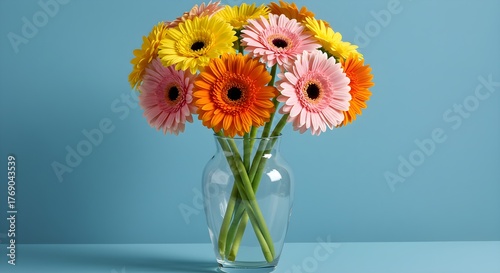 Colorful gerberas in glass vase against blue backdrop