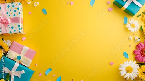 yellow, background, gift, flower, confetti, pink, blue, white, heart, daisy, gerbera, flower petals, celebration, spring, summer, festive, cheerful, bright, vibrant, happy, joy, colourful, decoration, design, party, present, ribbon, bow, floral, arrangement, pastel, occasion, holiday, romantic, love, gift, wrapping