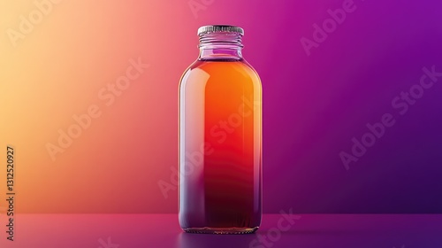 Colorful glass bottle filled with vibrant orange liquid against a gradient purple and yellow background