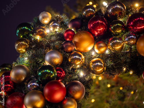 Colorful glass Christmas balls together with lighting beautifully complement the symbol of Christmas - the Christmas tree. Such a view can also be a beautiful Christmas greeting.