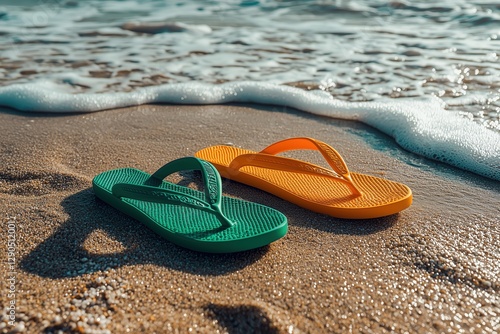 Colorful green and orange flip flops on sandy beach next to gentle ocean waves