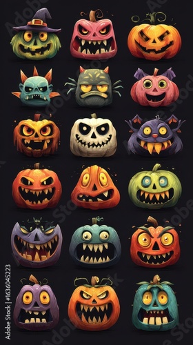 Colorful Halloween pumpkin faces in various expressions against a dark background