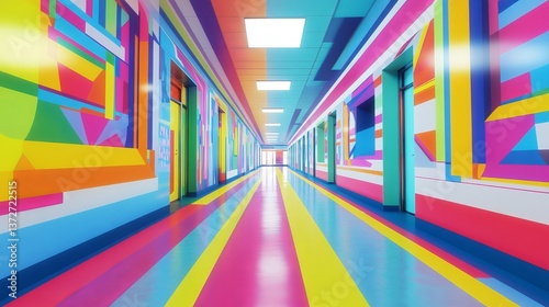 hallway, corridor, colourful, geometric, abstract, bright, light, perspective, interior, architecture, building, vibrant, pattern, design, art, wall, door, floor, rainbow, spectrum, modern, contemporary, creative, imagination, optical illusion, tunnel, vanishing point, line, shape, symmetry, interior design, bright light, vivid colors, high-coloured, vivid colors