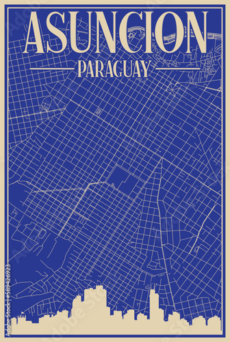 Colorful hand-drawn framed poster of the downtown ASUNCION, PARAGUAY with highlighted vintage city skyline and lettering
