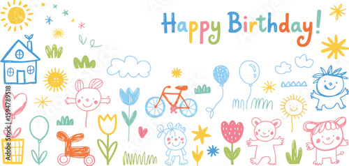 doodle, childish, funny, sun, flower, cloud, gift, balloon, bicycle, house, toy, star, grass, plant, nature, cartoon, cheerful, animal, bear, hare, tulip, sky, celebration, birthday, handwriting, line
