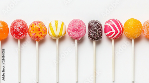 Colorful handmade lollipops arranged in row, showcasing vibrant designs and textures