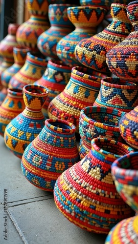 Colorful handwoven baskets with intricate patterns in vibrant display
