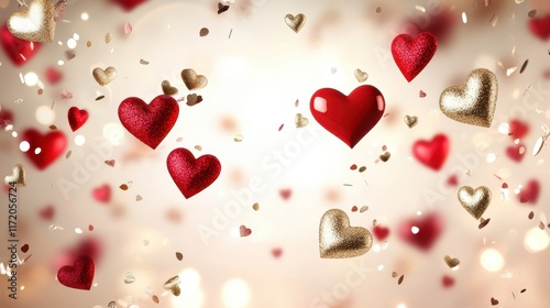 Colorful hearts float through the air amidst a backdrop of confetti and glitter, creating a festive atmosphere perfect for Valentine's celebrations.