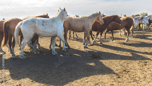 Colorful herd of American Quarter horses mares ,foals, and stallion on a plain