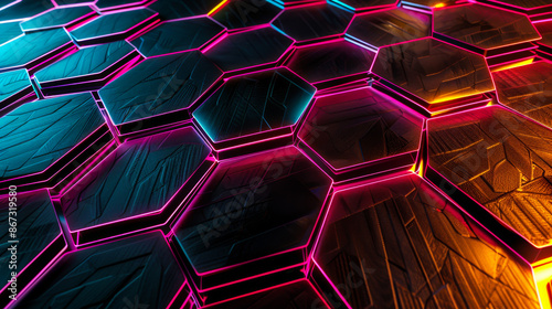 Colorful hexagon pattern with neon lights. The colors are bright and rich, creating a lively and energetic atmosphere. Abstract background.