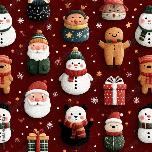 Colorful holiday decorations featuring various festive characters on a red background for winter celebrations