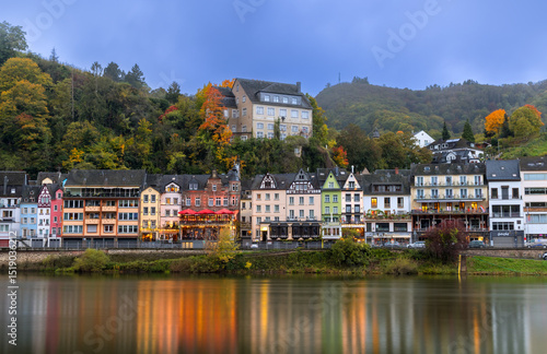 Colorful homes, shops and restaurants along Moselle river in Cochem, Germany.