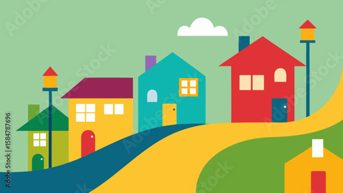 house, home, landscape, vector, illustration, building, city, town, sky, cartoon, village, architecture, tree, nature, summer, design, grass, street, cloud, farm, bungalow, sun, country, cloud, family