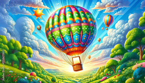 Colorful Hot Air Balloon Floating Above A Green Valley Under A Bright Blue Sky, Concept Of Travel And Adventure, Suitable For Tourism, Holiday Promotions, Travel Agencies, And Outdoor Marketing
