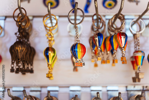 Colorful hot air balloon keychains beautifully hanging on a rack