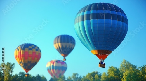 Colorful hot air balloons floating in blue sky over green forest landscape during sunrise for adventure travel tourism vacation and outdoor recreation background scenery