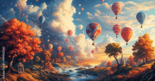 Colorful Hot Air Balloons Over Scenic Landscape At Sunset