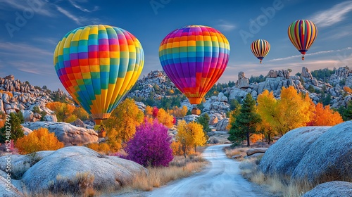 Colorful hot air balloons soar above a scenic landscape with autumn foliage and rock formations