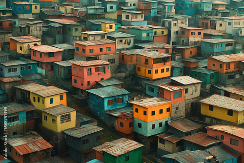 house, home, building, settlement, hillside, aerial, view, colourful, vibrant, dense, crowded, community, neighbourhood, urban, poverty, slum, dwelling, roof, wall, street, city, town, village, landscape, architecture, structure, colours, paint, red, orange, yellow, green, blue, teal, grey, brown