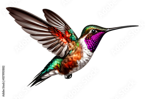 hummingbird, bird, flight, wing, feather, colourful, vibrant, green, red, purple, white, background, nature, wildlife, animal, avian, tropical, exotic, small, fast, beak, eye, head, tail, body, illustration, art, painting, digital, artwork, graphic, design, isolated, closeup, macro, sharpened, motion, blur, dynamic, beauty, wild, free