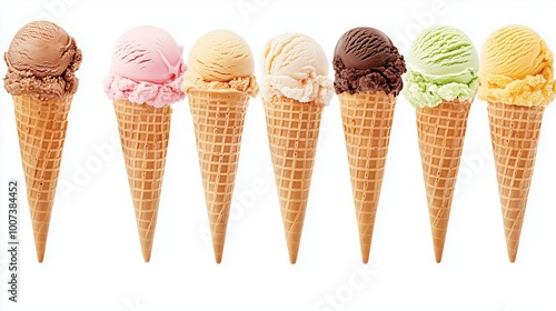 Colorful ice cream cones displayed in a row with various flavors during a sunny summer day