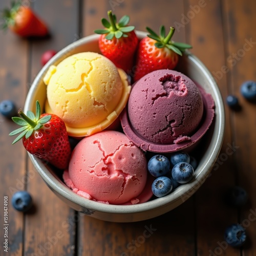 gelato, ice cream, assorted, variety, scoop, fruit, fresh, bowl, dessert, sweet, glacé, topview, overhead, rustic, wooden table, wood, natural, food, colourful, cold, chilled, treat, creamy, snack, tropical, summer, macro, closeup, styling, presentation, epicure, still life, food photography, composition, plated, homemade, traditional, dairy, refreshment, fruity, vibrant, background, surface, cookery, texture, pastel