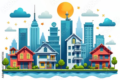 Colorful Illustration of a Cityscape with Skyscrapers and Houses