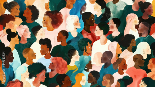 Colorful illustration of diverse crowd with various hairstyles and skin tones in profile.