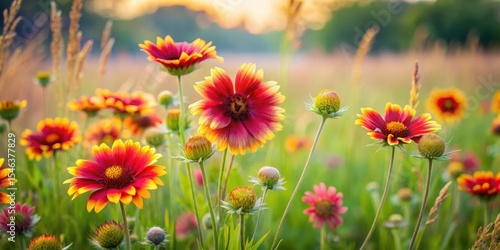 Colorful Indian blanket flowers blooming in a lush summer meadow with tall grasses and wildflowers swaying gently in the breeze