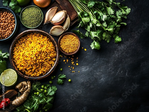food, indian, cookery, spice, curry, rice, lentil, herb, vegetable, garlic, onion, cilantro, ginger, turmeric, chili, lime, pea, ingredient, cooking, healthy, nourishment, receipe, preparation, favor, bowl, top, view, dark, background, colourful, fresh, tasty, delicious, diet, organic, natural, meal, vegetarian