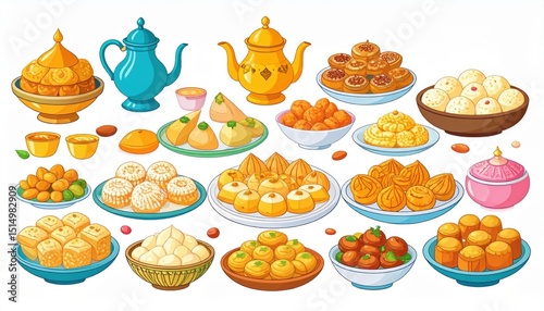 indian, food, dessert, sweet, colourful, dish, plate, display, tea, pot, cookery, traditional, sweet, item, various, treat, snack, food, photo, appetiser, festival, decorative, pixel, art