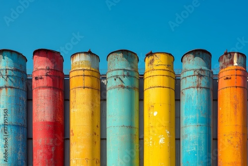 Colorful industrial silos stand against a clear blue sky in an urban setting on a sunny day