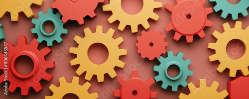 Colorful interlocking gears in red, yellow, and green arranged on a flat surface, symbolizing mechanics and teamwork.