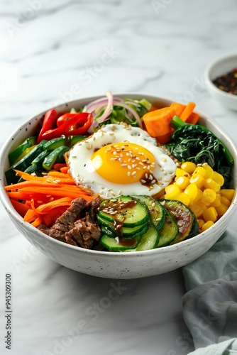 Colorful Korean bibimbap served in a bowl with fresh vegetables, egg, and beef on a marble countertop