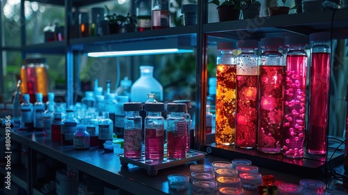 Colorful laboratory setup with various chemical solutions in beakers and flasks, illuminated under ambient light, creating a scientific ambiance.