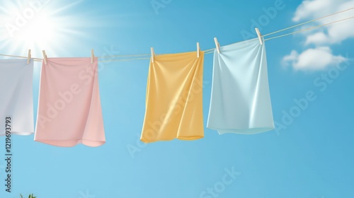 colorful laundry drying on clothesline under sunny blue sky, fresh air drying, eco-friendly cleaning, bright and cheerful outdoor scene.