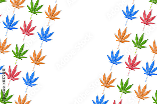 Colorful leaves of hemp or cannabis diagonal pattern on white background.
