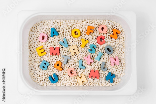 Colorful letters of the alphabet in sensory bin. Primary school or preschool, kindergarten. Educational game. Learning through play. Sensory play for toddlers..