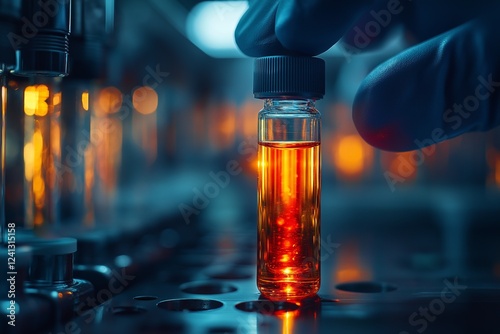 Colorful liquid in vial held by gloved hand in veterinary laboratory setting, showcasing advancements in veterinary medicine. Concept focuses on veterinary laboratory innovations and research