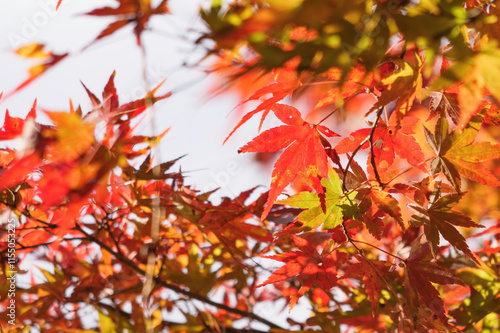 Colorful maple leaves illuminated by sunlight, a typical Japanese autumnal scene.
