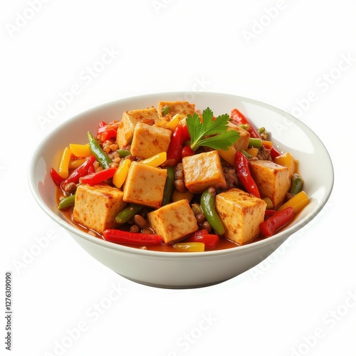 tofu, bowl, food, cookery, vegetarian, gastronomy, nourishment, asian, dish, spice, dinner, meal, epicure, plate, culinary, diet, lunch, eating, delicious, dining, vegetable, a, tasty, healthy, pepper, snack, and, eatery, served, cooked, in, with, kitchen, up, serving, colourful, fresh, traditional, close, nobody, white