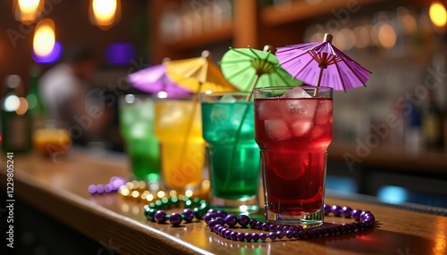 Colorful Mardi Gras cocktails with beads and umbrellas at bar.