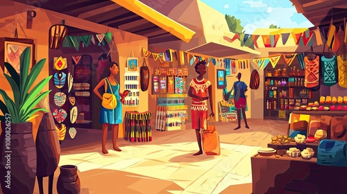 market, stall, people, tropical, location, colourful, vibrant, good, item, display, shelf, product, merchandise, souvenir, artwork, decoration, flag, pattern, texture, sunny, day, bright, light, shadow, perspective, cartoon, illustration, digital, art, graphic, design