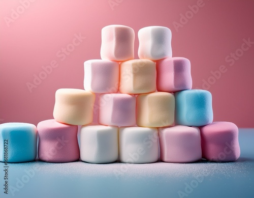 colorful marshmallows stacked on a pink background with soft lighting for a sweet treat presentation