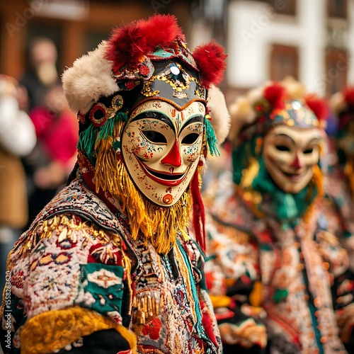 Colorful masked performers in traditional attire celebrating a cultural festival in a lively crowd