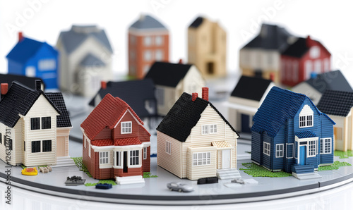 Colorful miniature houses arranged on a circular layout showcasing various architectural styles and vibrant colors with intricate details for real estate concepts.